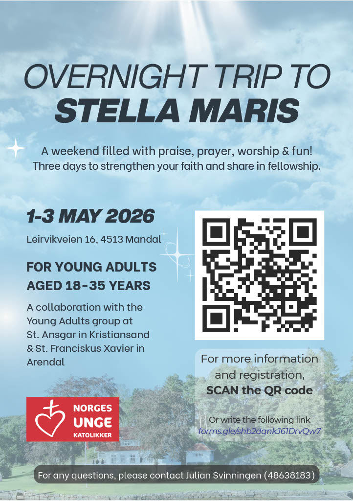 I mai og oktober, ber vi rosenkransen kl. 18.00 hver kveld før messen.