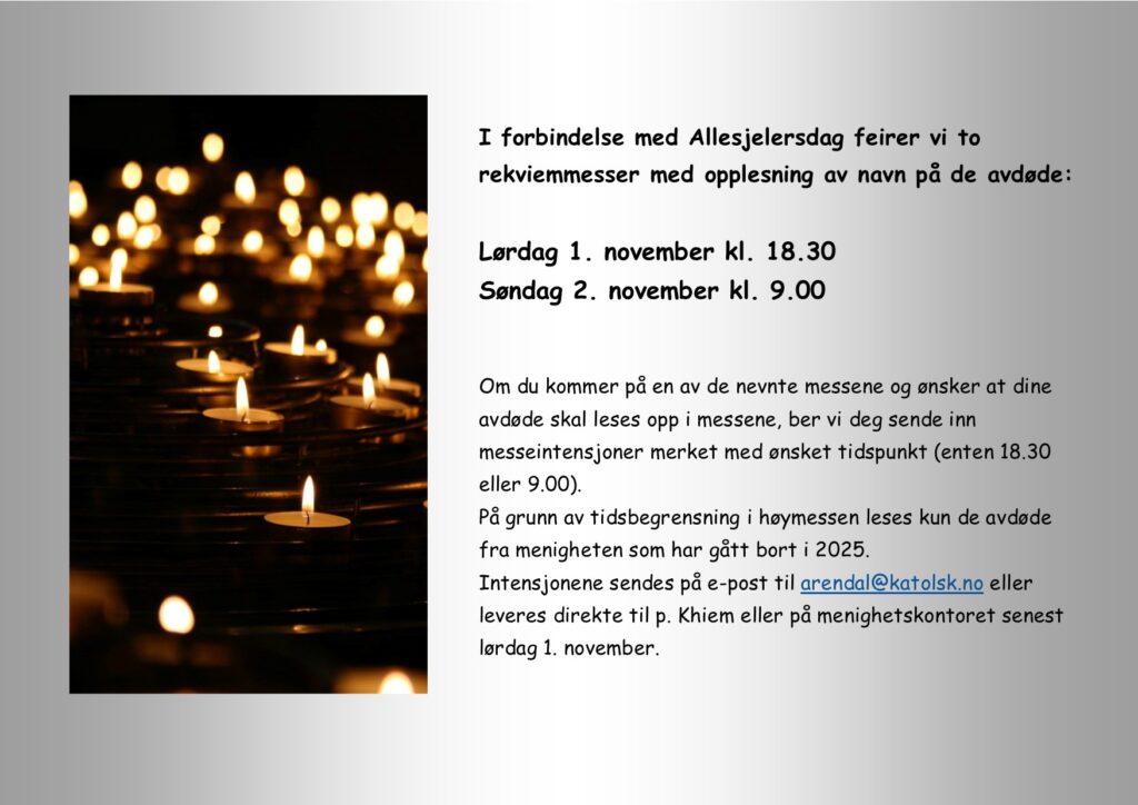 Kollekt fra søndag 26. oktober – kr 9 179. Lørdag 1. november – Allehelgensdag 11.00 – Høymesse18.00 – Rosenkransandakt og skriftemål18.30 – Messe (Rekviemmesse) Søndag 2. november – Allesjelersdag09.00 – Messe (Rekviemmesse)10.15 – 10.45 – Skriftemål11.00 – Høymesse etterfulgt av kirkekaffe13.00 – Skriftemål på polsk13.30 – Messe på polsk Tirsdag 4. november – Den hellige […]